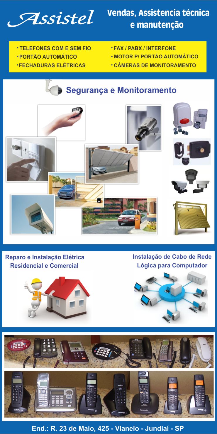 Vendas, Instalação e Assistência Técnica: Telefones com/sem fio, Fax, PABX, Headset, Headfone, Interfones, Portão Automático, Motor para Portão Automático, Fechaduras Elétricas, Câmeras de Monitoramento.